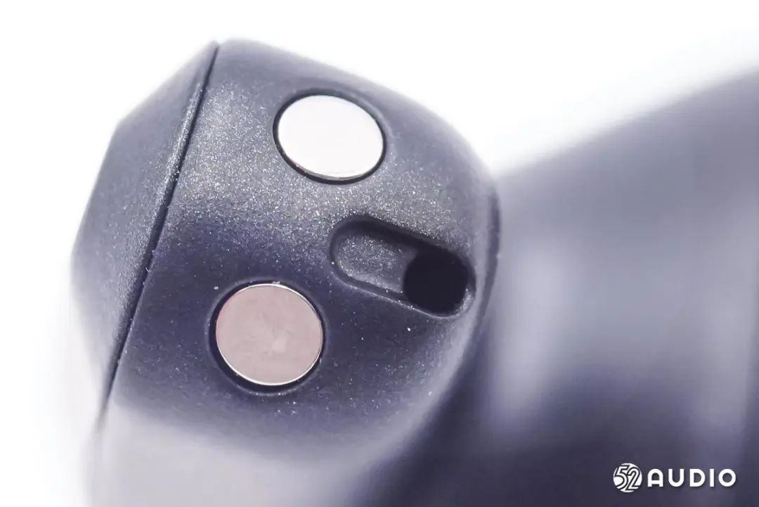 通话麦克风拾音结构特写,抗风噪设计,提升语音通话的性能。底部是为耳机充电的两颗充电铜柱连接器。