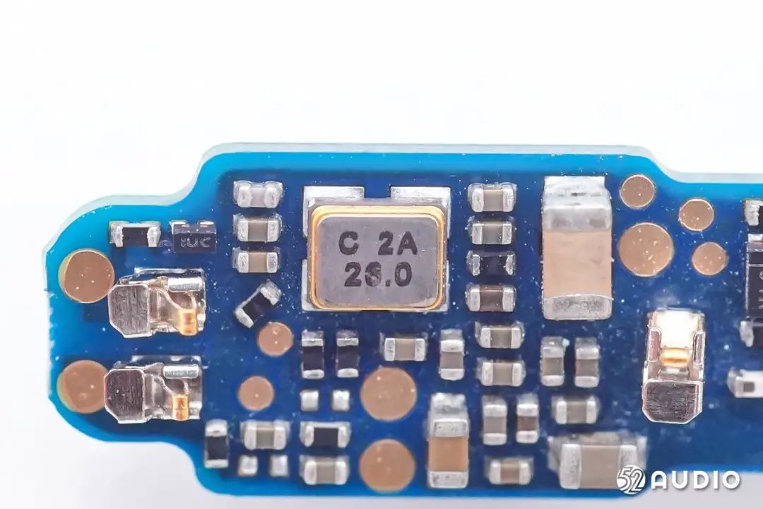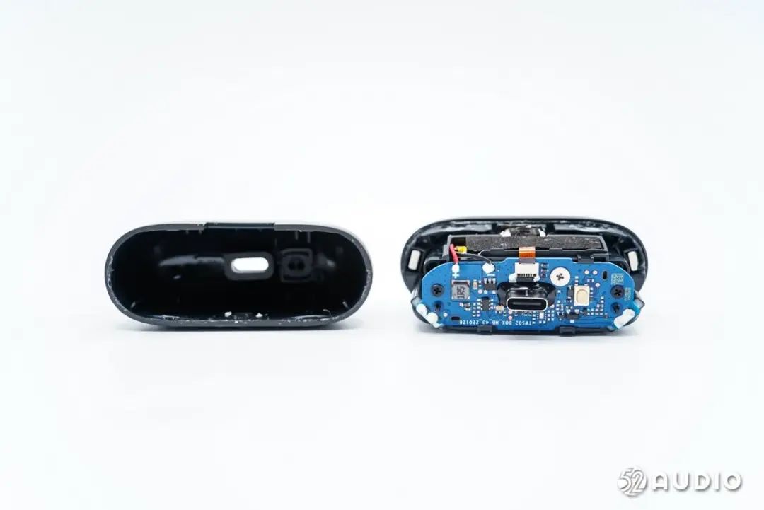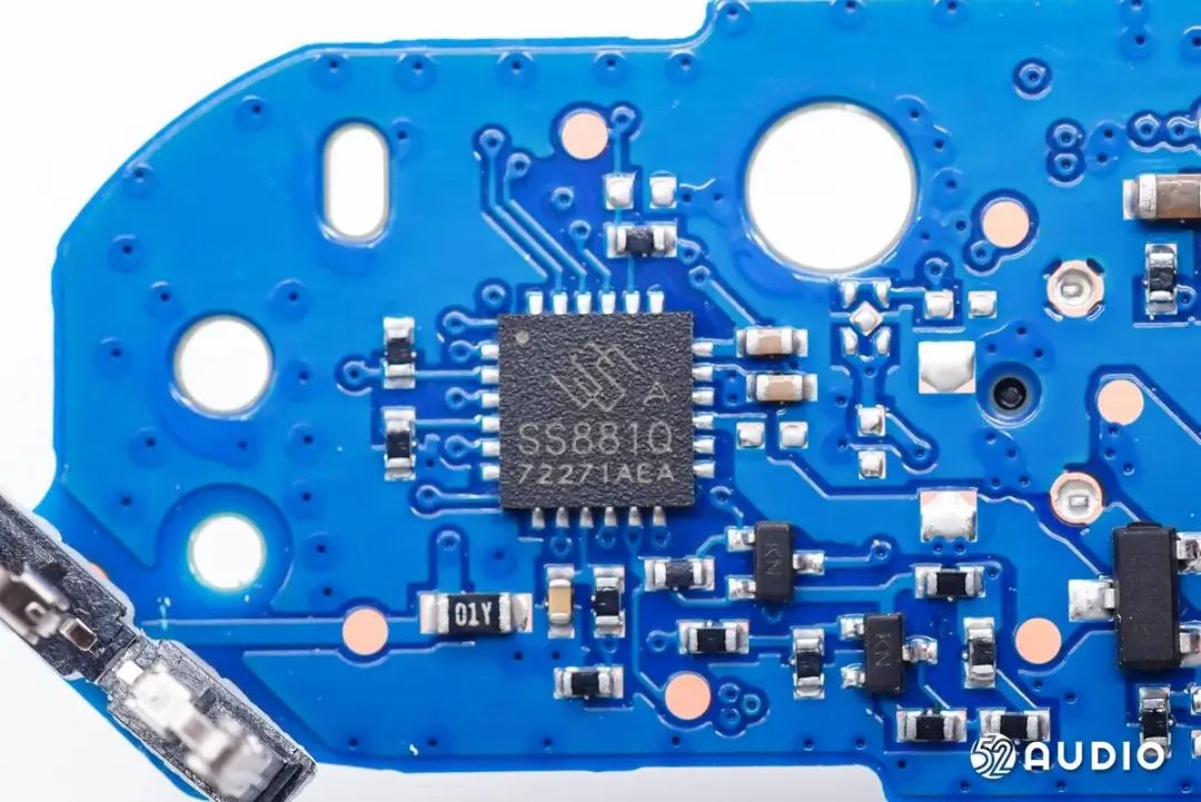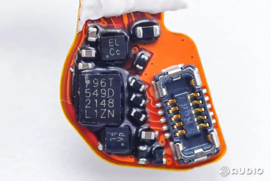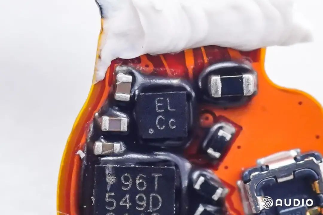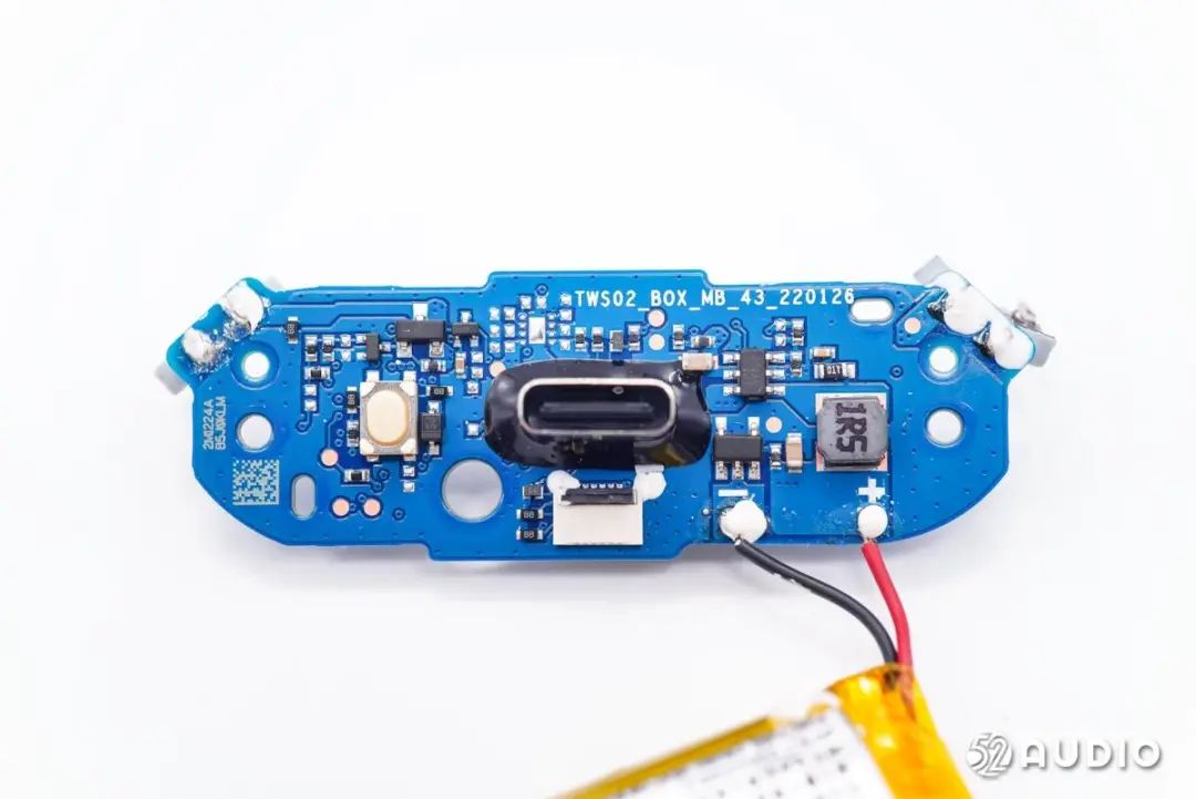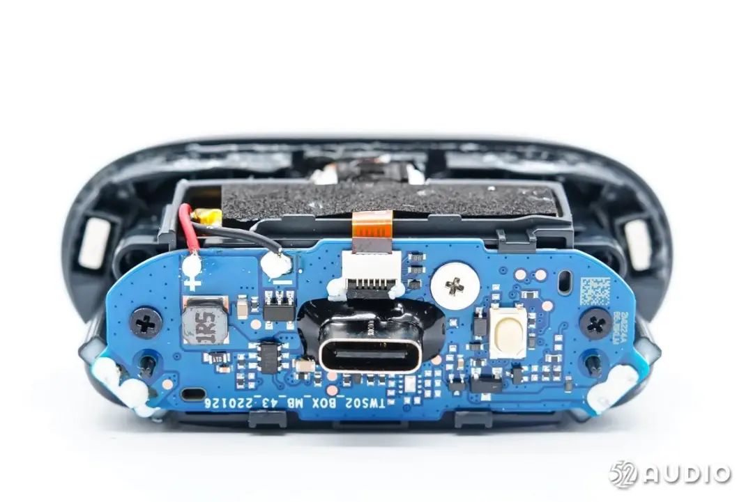 内部电路方面,充电盒采用了Type-C接口输入电源,内置亿纬锂能590mAh 3.87V高电压锂电池,配备ⅩB5152UA2SZR一体化锂电保护IC;主板上采用了昇生微电子SS881Q POWER MCU,集成电池充电管理及单片机,负责电源管理及充电盒控制等功能;微源半导体LP6252F同步升压IC,搭配精睿兴业定制充电弹片、铜柱和夹子为耳机充电。