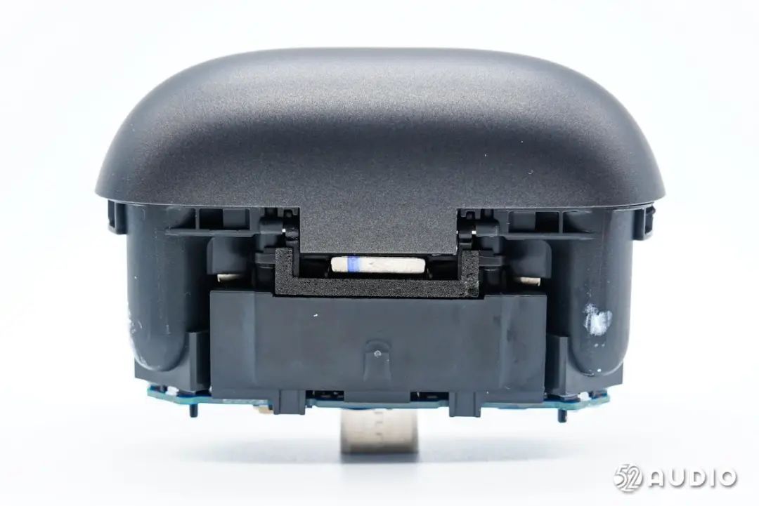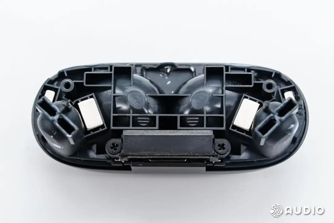 座舱底部结构一览,设置有四颗磁铁,用于吸附充电盒盖和耳机。