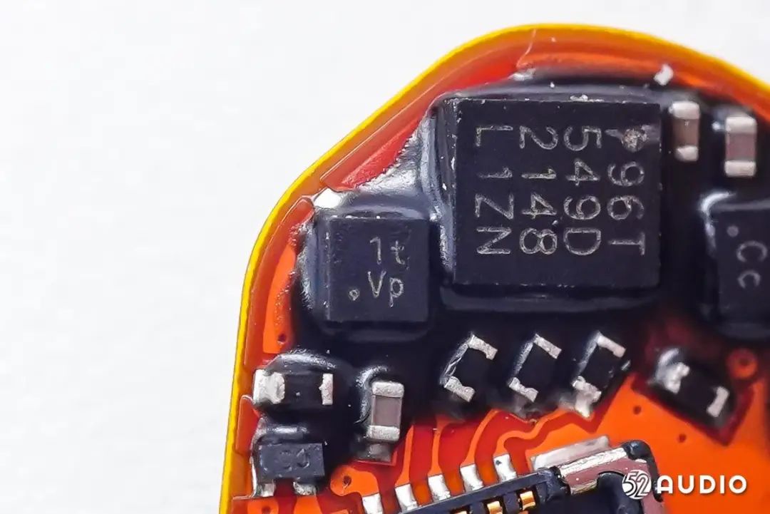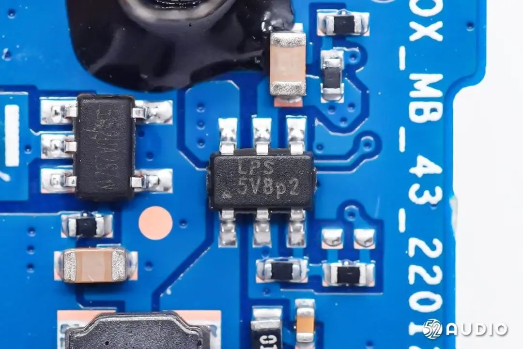 丝印1mBo的霍尔元件特写,用于感知充电盒开启/关闭时的磁场变化,进而通知充电盒MCU和耳机与已连接设备配对或断开连接。