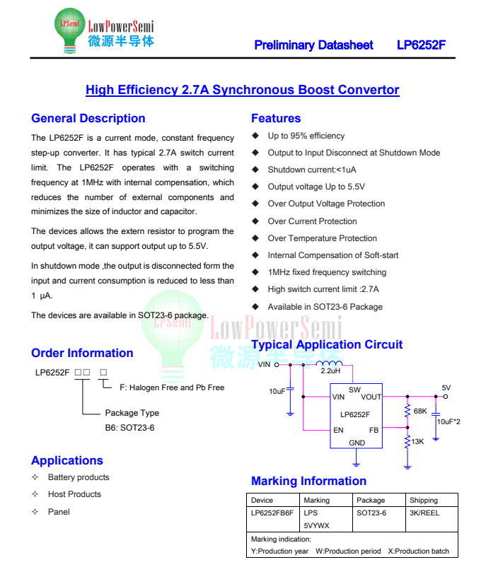 LPS微源半导体LP6252F同步升压芯片,采用SOT23-6封装,LP6252F 1MHZ的开关频率,并带有内部补偿,从而减少了外部元件的数量,并最小化了电感和电容的尺寸;允许外部电阻对输出电压进行编程;在关机模式下,输出与输入断开,电流消耗降至1μA以下。