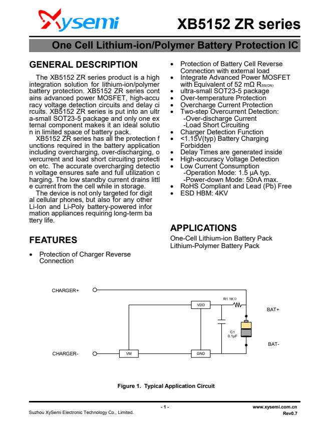 苏州赛芯电子科技股份ⅩB5152UA2SZR一体化锂电保护IC。XB5152 ZR系列产品是用于锂离子/聚合物电池保护的高度集成解决方案,包含先进的功率MOSFET、高精度电压检测电路和延迟电路,采用超小型SOT23-5封装,只有一个外部组件,是电池组有限空间的理想解决方案。