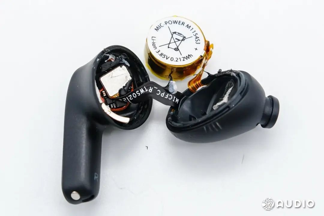 耳机内部采用了钢壳扣式电池,标签上丝印信息有型号:M1154S3,额定电压:3.85V,容量:0.212Wh,来自MIC-POWER微电新能源。