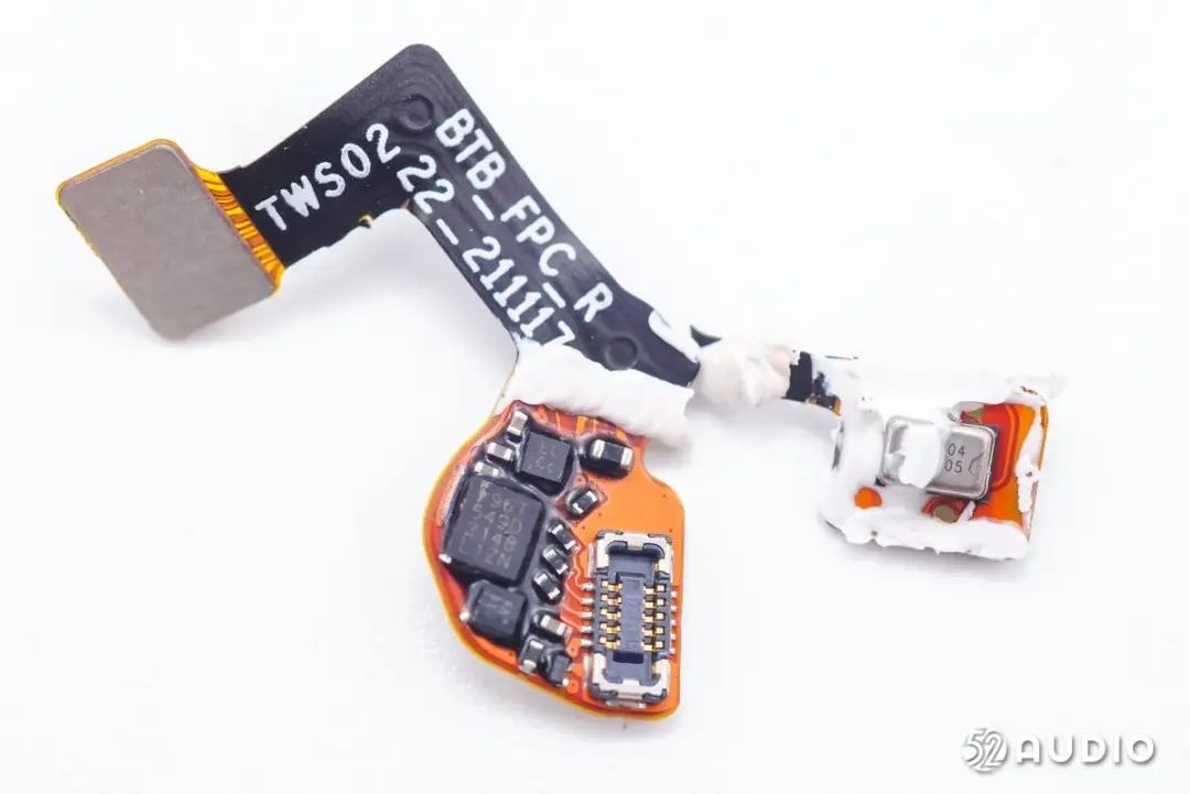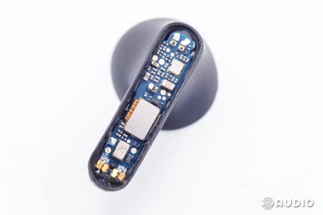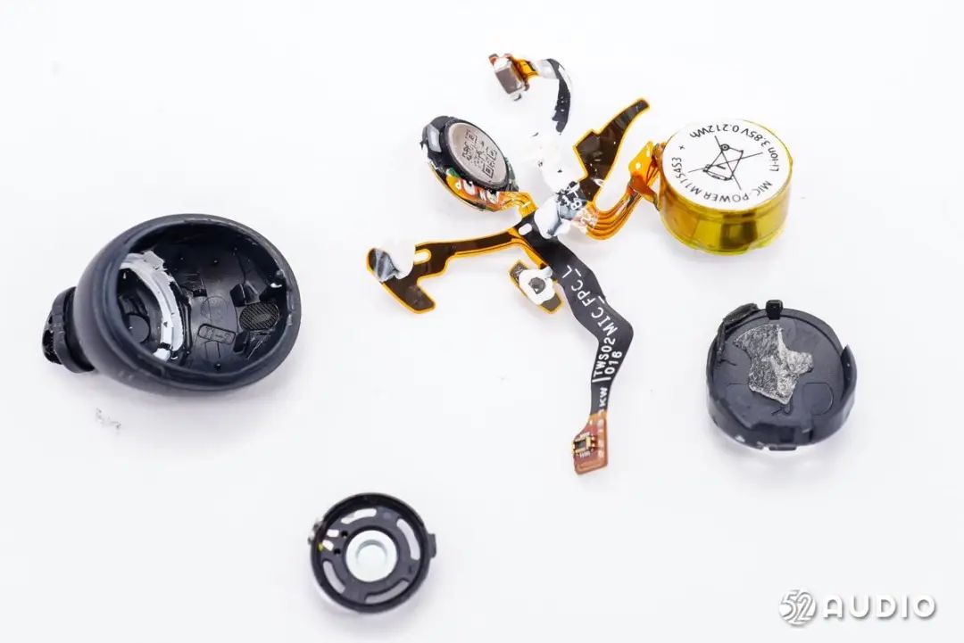 耳机前腔内部拆解组件一览,包括同轴双单元、电池、麦克风和入耳检测传感器贴片。