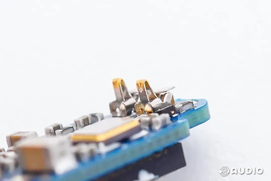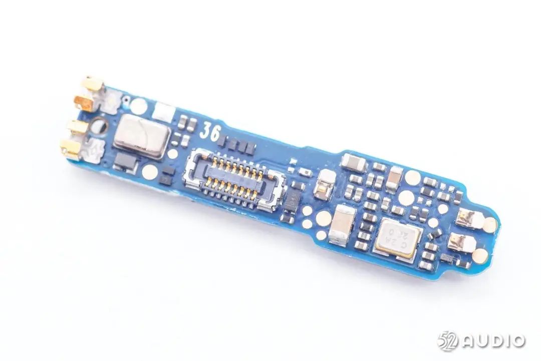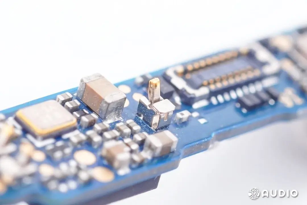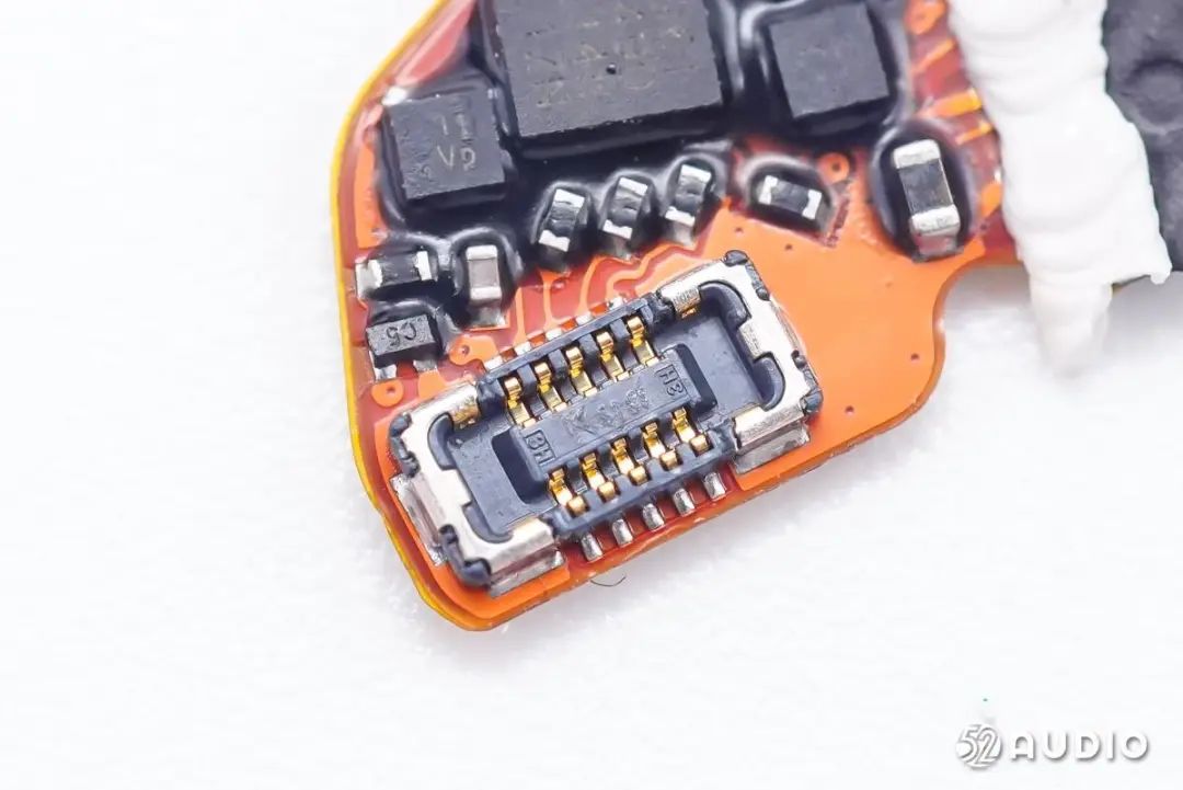 主板上为耳机充电的金属弹片设计较为新颖,定制的充电弹片与充电仓做深度配合,能够做到生活防水。同时充电弹片与耳机接触的部位为银色铂金复合镀层,可以避免带汗液充电时对充电弹片的腐蚀,可顺利获得耐汗液电解30分钟。据分析,此款充电弹片来自深圳市精睿兴业科技有限公司。