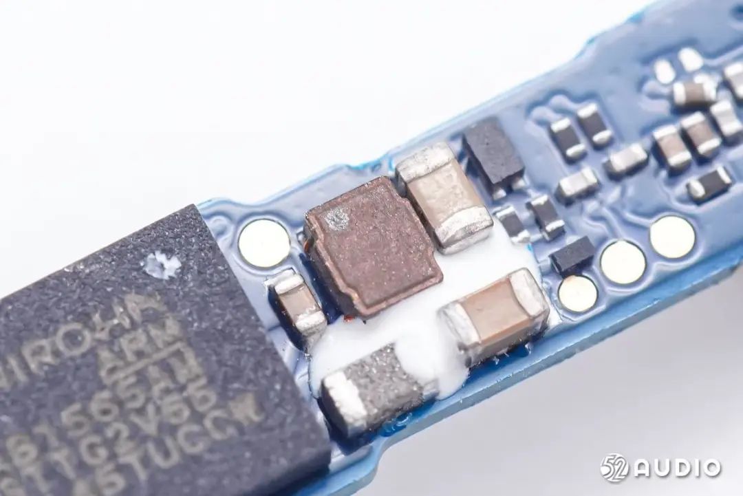主控芯片外围一体成型功率电感特写,用于为蓝牙芯片内部升降压电路供电。
