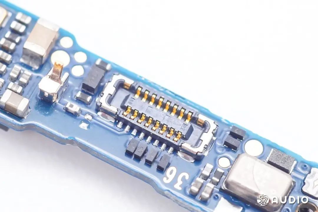 主板上用于连接充电铜柱为耳机充电的夹子连接器特写,设计新颖,解决了传统充电铜柱生产时定位的问题同时还能做到铜柱处的防水。据分析,此款夹持铜柱的夹子来自深圳精睿兴业科技有限公司。